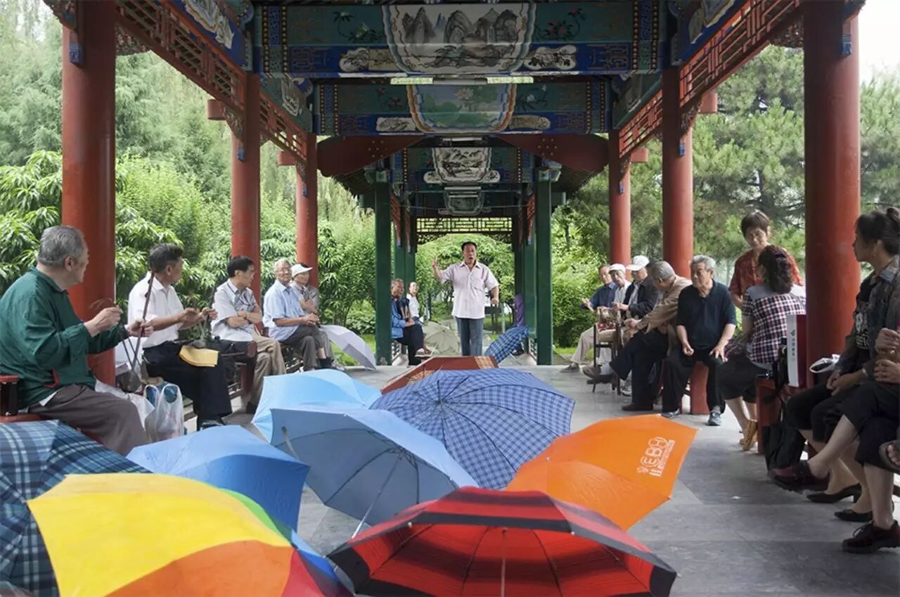 點評:攝影師呈現了公園一角的小景致,屋檐圍繞成天井,綠色植物順房檐垂下來,形成了一片私密安靜的空間,框式構圖使畫面顯得更加穩定,天井分隔開兩個空間,引發觀者想象。