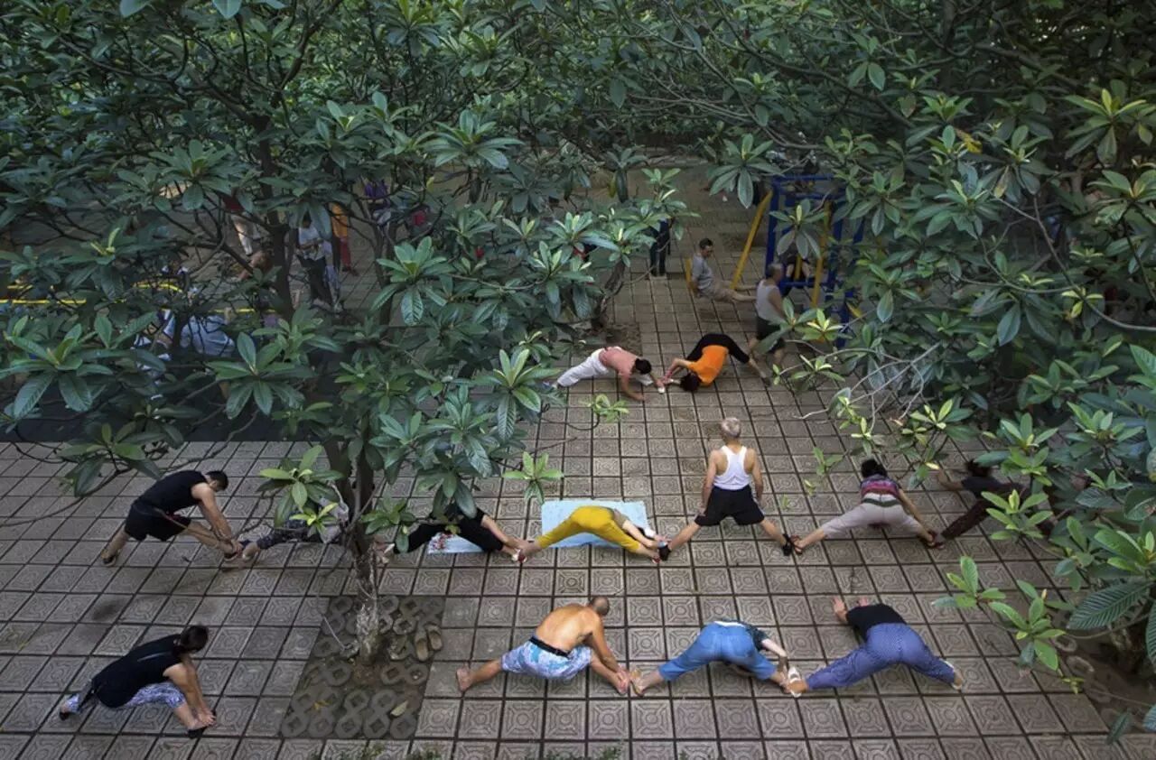 點評:俯拍的角度使人們的行為獲得了更加符號化的表達,構圖簡潔明了,畫面形式感強烈,主體十分醒目。位于黃金分割部位穿白背心的老者,其獨特的姿勢儼然現場的統帥般鶴立雞群,增強了畫面隊列的變化,自然的畫面表現出公園內老人鍛煉的生動場景,生活氣息濃厚。