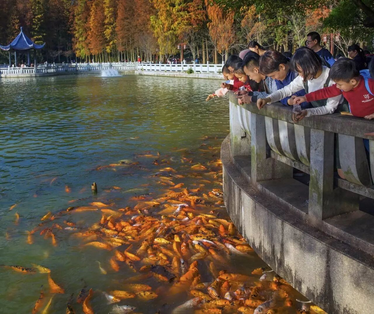 點評:這是公園中常見的場景,人們正在給水中的鯉魚喂食。攝影師構圖技法成熟,不但講了故事,同時在空間的表現與季節背景的交代上也很到位。水中鯉魚的顏色與背景處楓葉相互呼應,突出了秋天的特點。