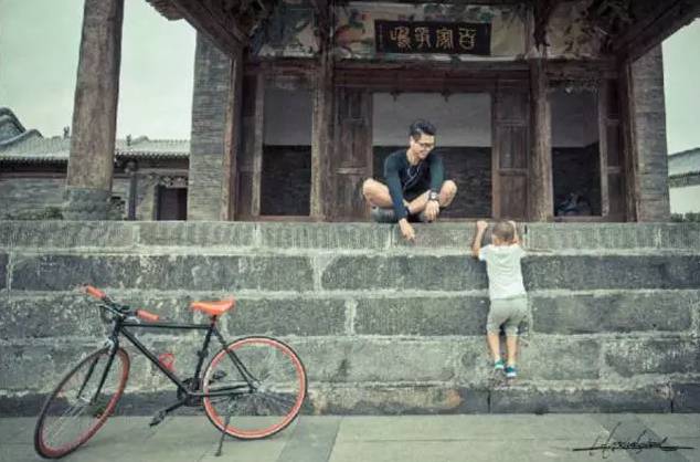 當時我架好三腳架,擺好自行車的位置就坐上戲臺,忽然這個時候有個小孩想跳上來一起和我拍照,但他怎么都爬不上,正當我想拉他一把的時候覺得應該按下快門,果然,這是一個很有意思的畫面。