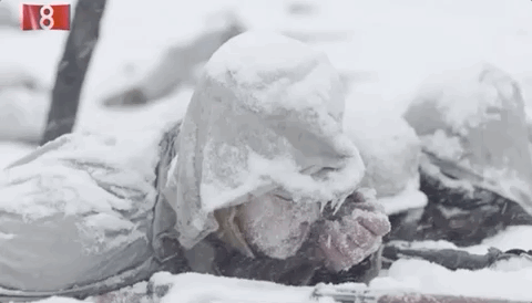 在零下30攝氏度的嚴寒下,堅守死鷹嶺的志愿軍戰士。