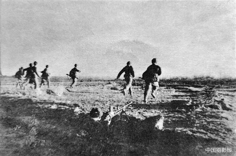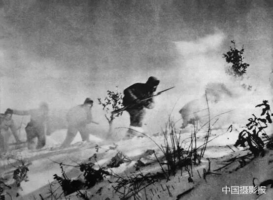 1950年12月,長津湖戰役中,中國人民志愿軍第27軍戰士們在炮火和風雪中追擊敵人。 張崇岫 攝
