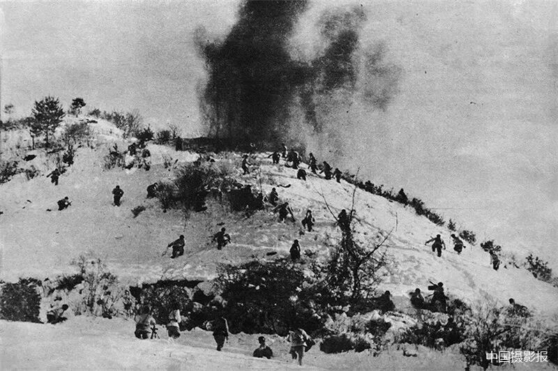 1950年12月,中國人民志愿軍第27軍在長津湖戰役中冒著炮火,強攻美海軍陸戰隊1師山頭陣地。 張崇岫 攝