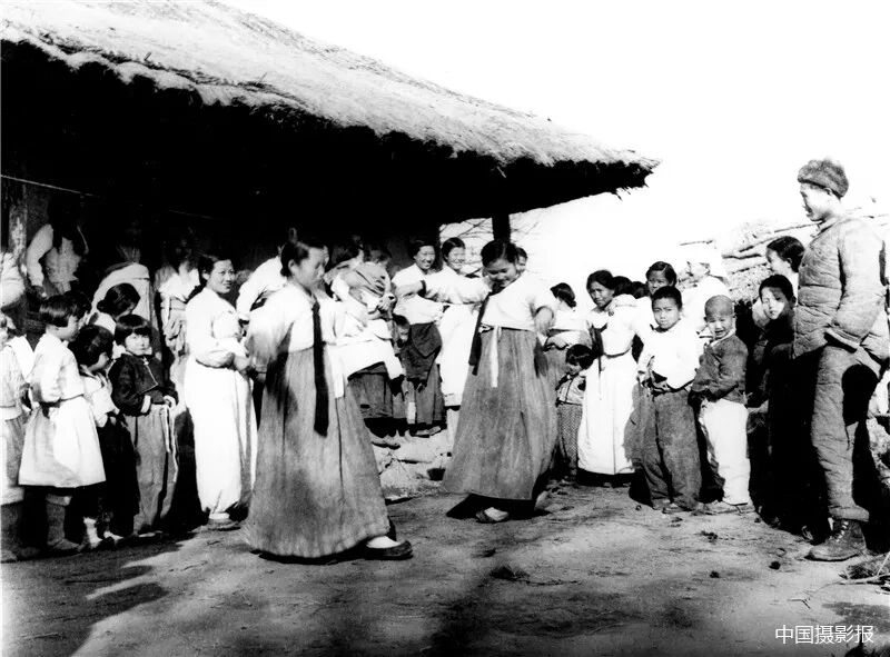 1950年冬,朝鮮元山,中國人民志愿軍第九兵團駐地附近的朝鮮婦女載歌載舞。張崇岫 攝