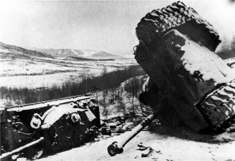 1950年12月,朝鮮長津湖公路旁,中國人民志愿軍擊潰美國陸軍第7步兵師的兩輛重型坦克。 張崇岫 攝