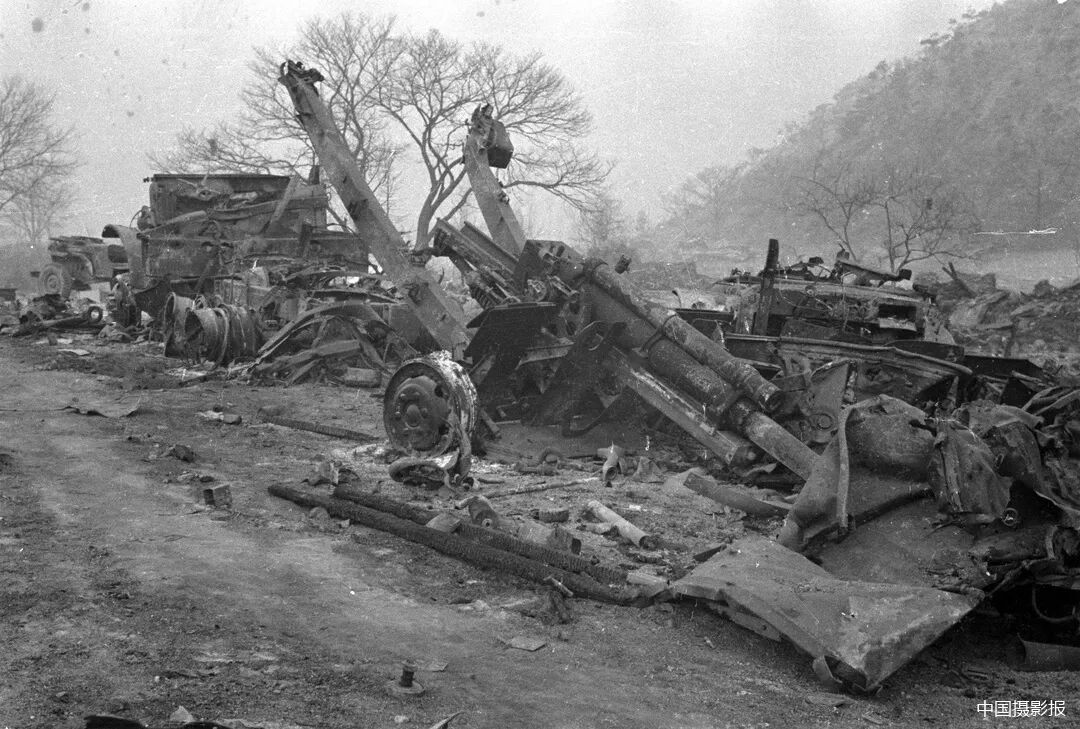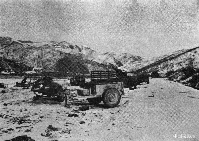 1950年12月,在長津湖戰役中被中國人民志愿軍擊毀的美軍汽車和重炮。 張崇岫 攝