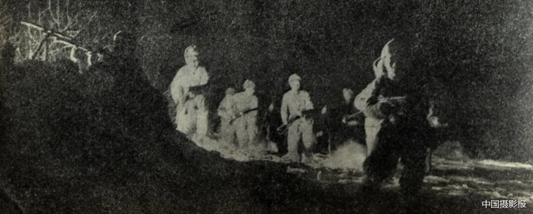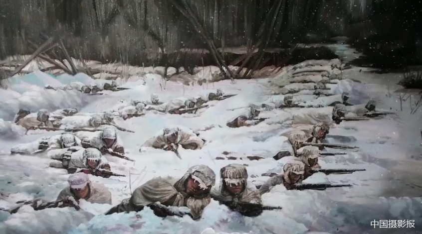 長津湖滿地白雪,在拍攝時需要在反差極大的情況下設置曝光,張崇岫在手被凍得半僵的情況下很好地處理了這一難題,且構圖嚴謹、法度井然。他和戰士們一道沖鋒,記錄下志愿軍戰士們忍凍挨餓、在膝蓋高的雪地里行軍的畫面;記錄下戰士們趁著夜色趕到預定作戰點,在雪地俯臥埋伏的場景……