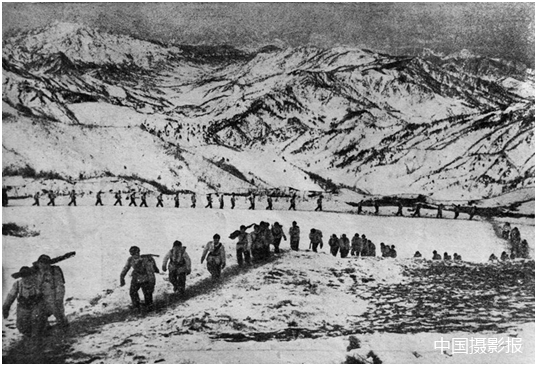 1950年11月,中國人民志愿軍第27軍跨過冰天雪地的北部山區,向南朝鮮長津湖地區前進,迎戰向北推進的美國海軍陸戰隊第1師。 張崇岫 攝