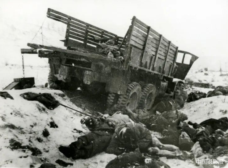 1950年12月,長津湖戰役現場,被擊毀的卡車和美軍士兵尸體。 張崇岫 攝