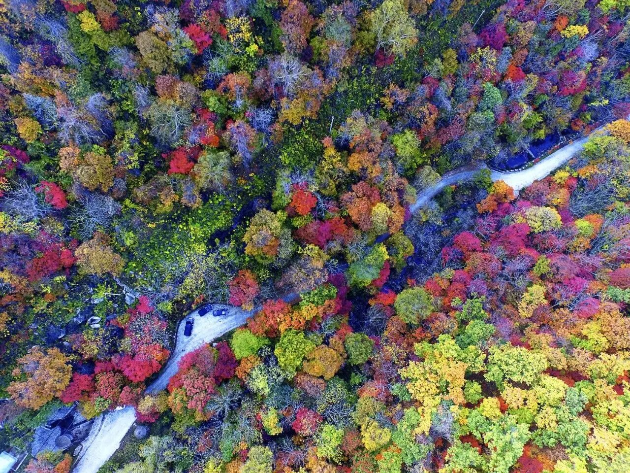 點評:以往拍秋色,正常視角看來都是層林盡染,航拍俯瞰卻猶如畫家的調色板,色彩變成噴薄而出的色塊,確實帶來觀看的新意,一條公路從對角線方向“平分秋色”,讓畫面跳脫出原有的僵硬,多了些許的變化。