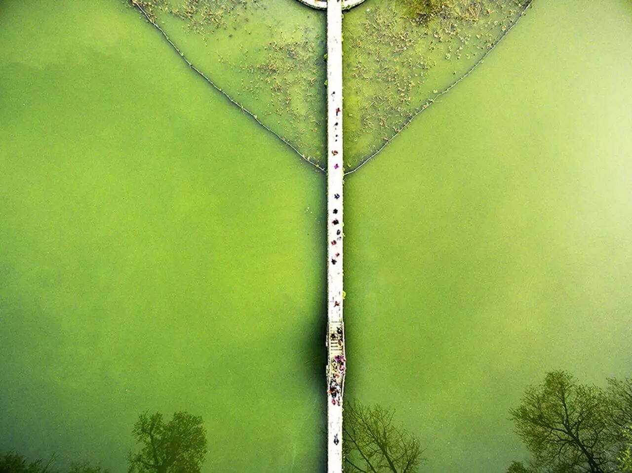點評:航拍特別適合對稱式構圖,一座大橋連貫兩岸,就猶如一本打開的書,左右都是浩瀚的池水,只有中縫細長的一條,連接著想要到達彼岸的彼此。悠揚的湖色配以幾抹樹影的點綴,讓這幅作品增添了不少構成上的修飾。