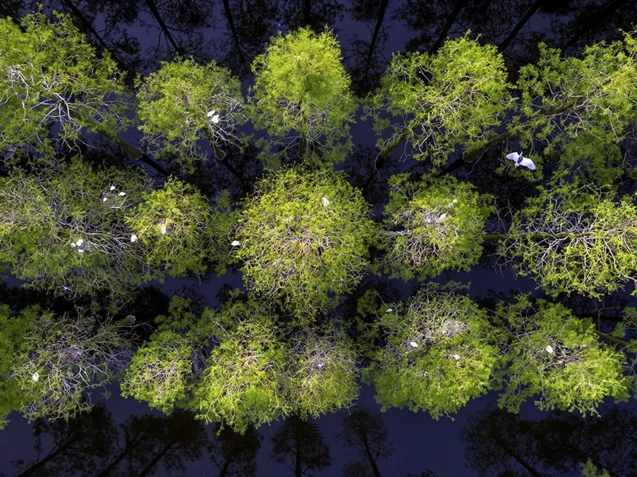 點評:視野的變化,給讀者全新的體驗:陽光下聳立在陰暗濕地上的高大水杉成了一個個鮮綠的絨球,棲于樹頂的白鷺點綴了畫面,偶有一只飛起,給畫面增添了無限活力。照片構圖中正豐滿,色彩運用鮮而不沉,航拍視角中正下視,讓讀者有一種雄鷹俯瞰的體驗。