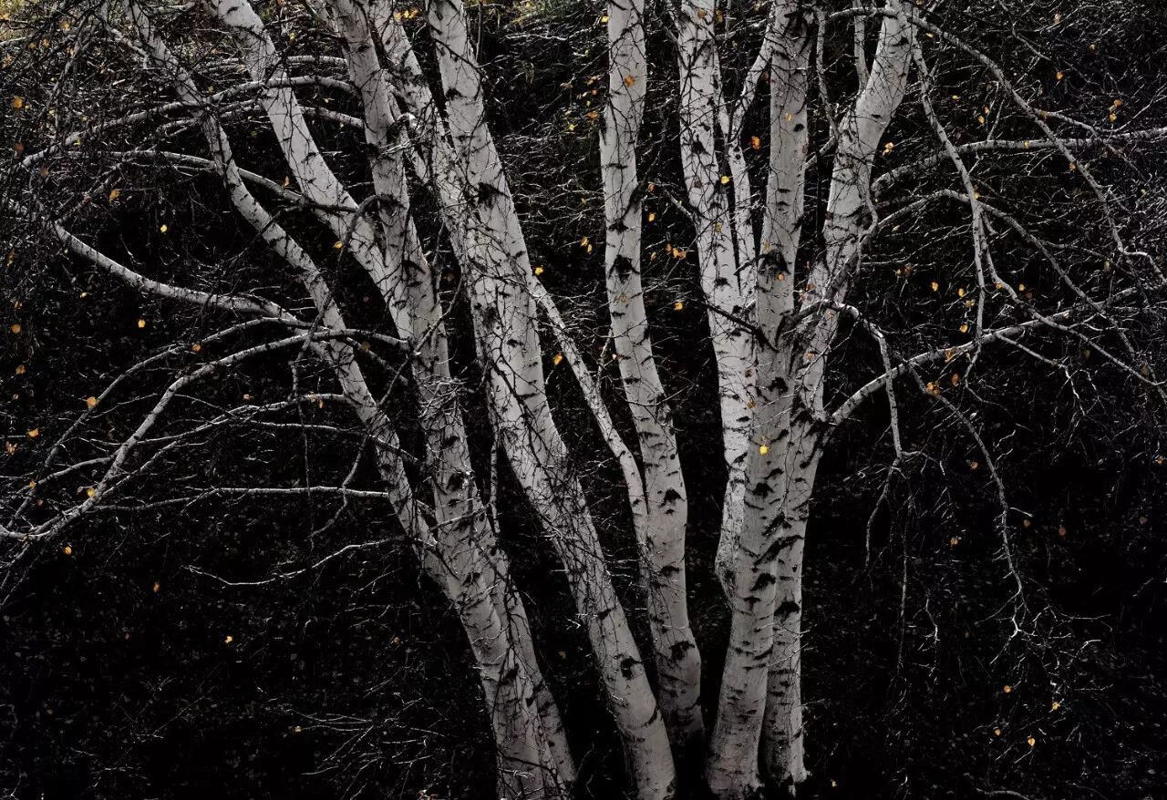 點評:在這幅畫面中,深色的背景處理將灰白色的樹木形態有效凸顯了出來,而點綴在樹木之上的星點黃葉則在消色的氛圍中展現出生命的寓意,不僅生動了畫面的色彩,還帶給觀者以豐富的想象空間。