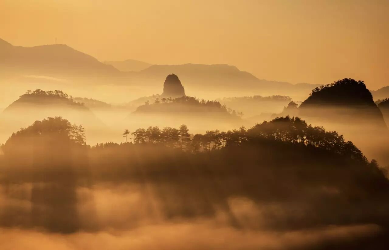點評:光線是這幅畫面的魅力所在。金黃色的霞光映射天空與大地,帶來富有感染力的色調,而因為山脈樹木的遮擋呈現出四射光芒的霞光在山霧的渲染下,呈現出濃淡虛實之意境,神秘似仙境。