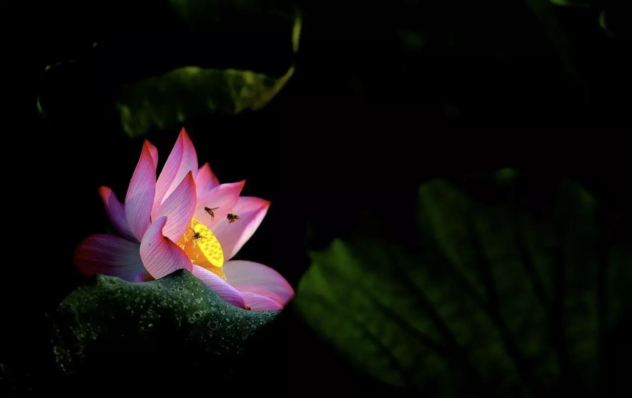 點評:在這幅畫面中,幽暗的背景環境為畫面明暗對比之運用提供了較好的條件,而荷花也在這種對比之下得到了凸顯,并使得其色彩看上去更加明亮飽滿起來,其間的蜜蜂則為畫面帶來了生機和情趣。