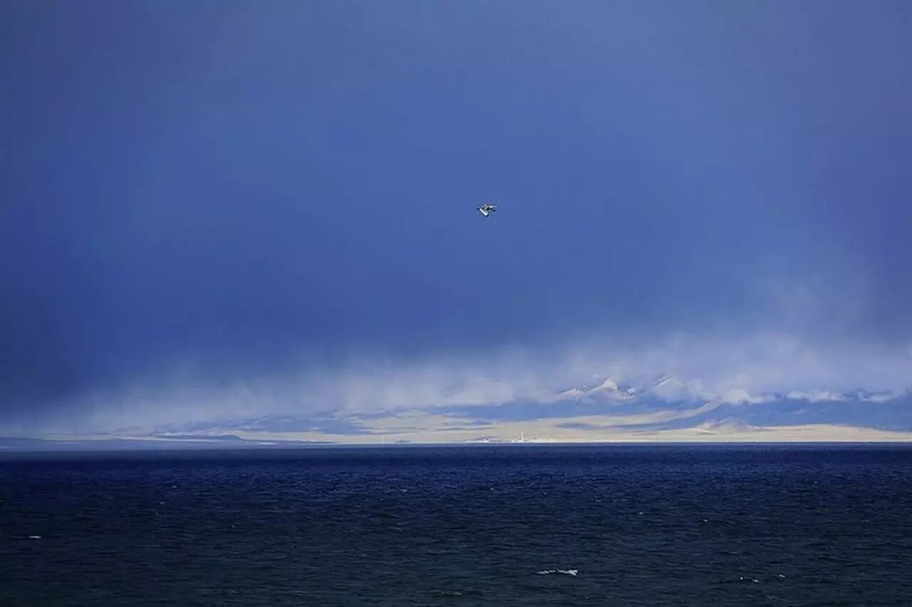 點評:在這幅藍色調為主的畫面中,透露著沉靜、深邃之意境。深藍色的水面和平直的海平面使得畫面沉著穩定,淡藍色的天空則為畫面帶來變化,而飛翔的水鳥則成為點睛之筆,避免了畫面的空洞。