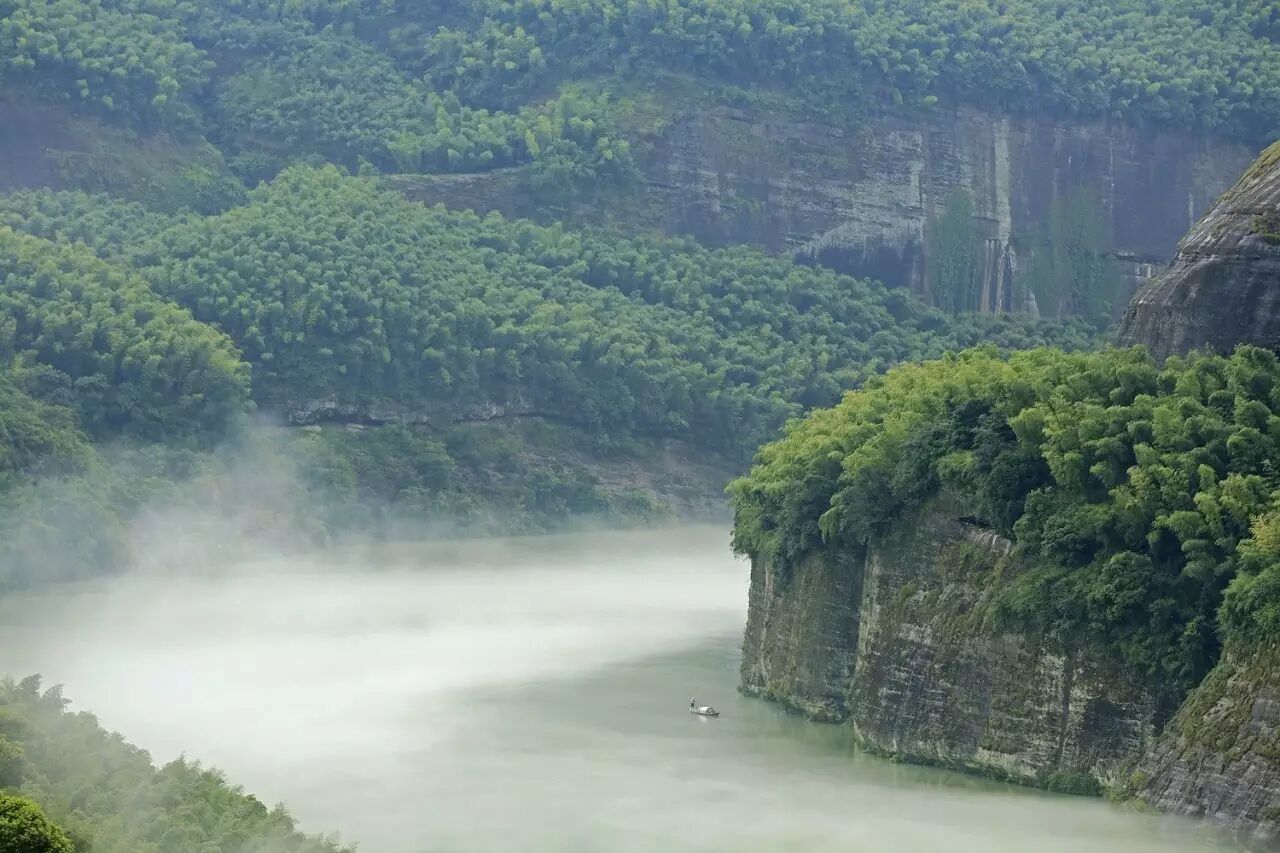 點評:在煙霧縹緲的江面上,一葉輕舟點綴其間,為風景畫面帶來別樣的趣味元素。而在由小舟形成點和江面形成的面的對比構置之下,展現出了畫面空間的廣闊意味和懸崖峭壁的陡峻之勢。