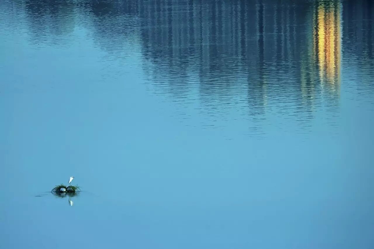 點評:攝影師采用留白寫意的表現手法,將大面積的水面“空置”,來襯托水鳥的存在,并通過獨特的構圖和水中倒影的渲染,營造出一種寂寥的氛圍,引導觀者的閱讀情感,并產生聯想空間。