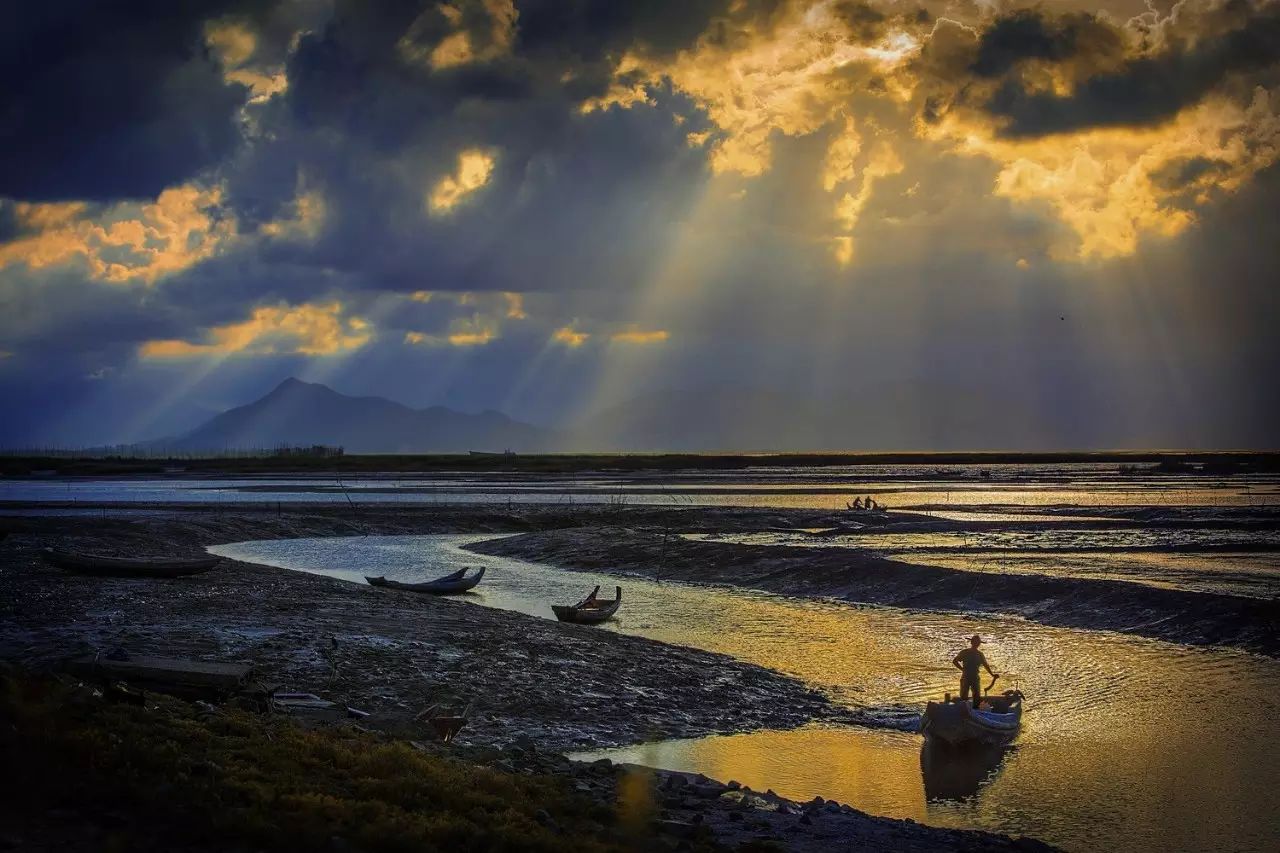 點評:攝影師通過云層帶來的射光效果,將云層的色彩和水面反光巧妙結合,營造出一種濃烈的光感氛圍,而其中的駕船人則在金黃色的光線之中展現出生動的剪影形態,增強了其視覺沖擊力。