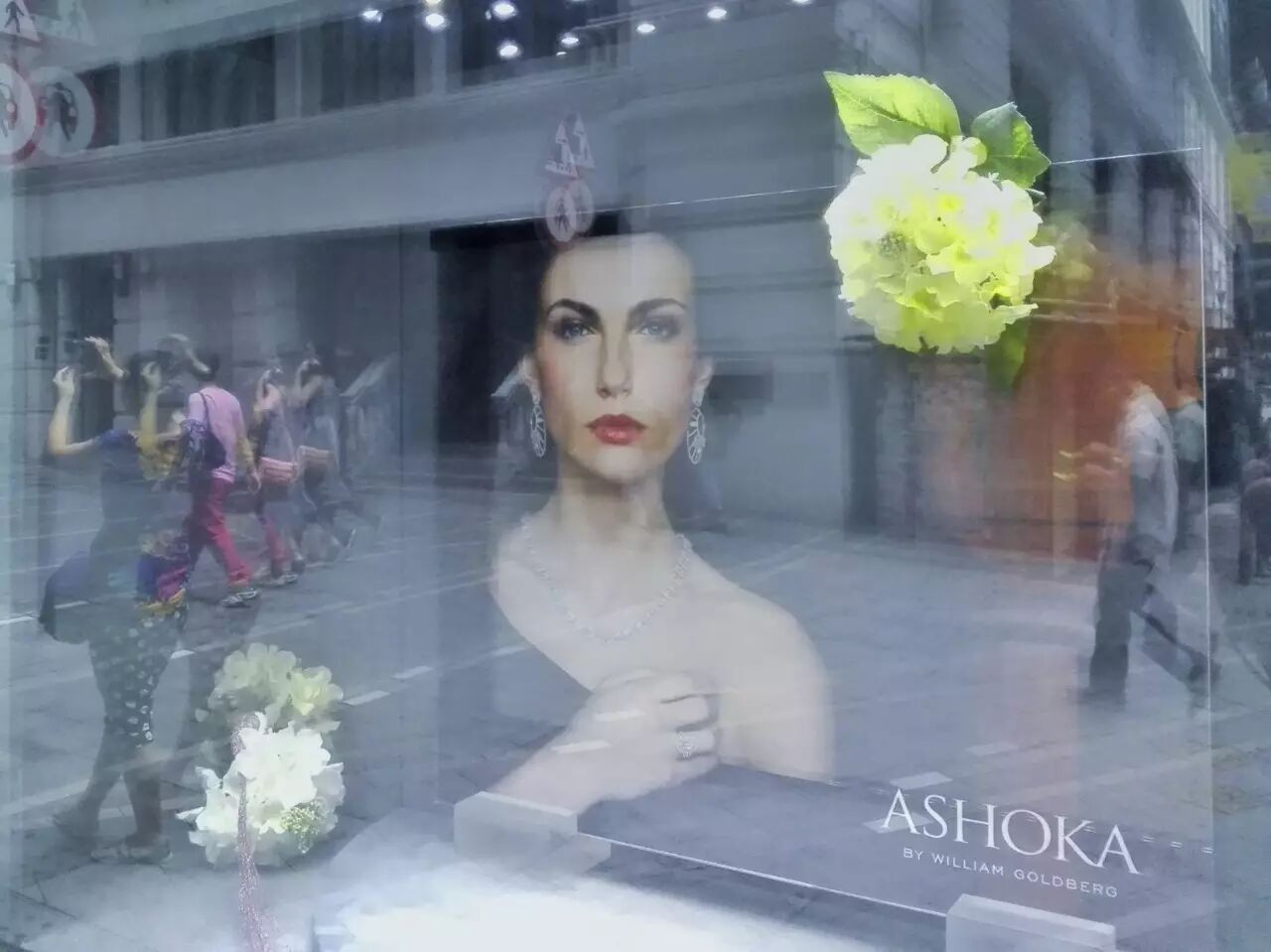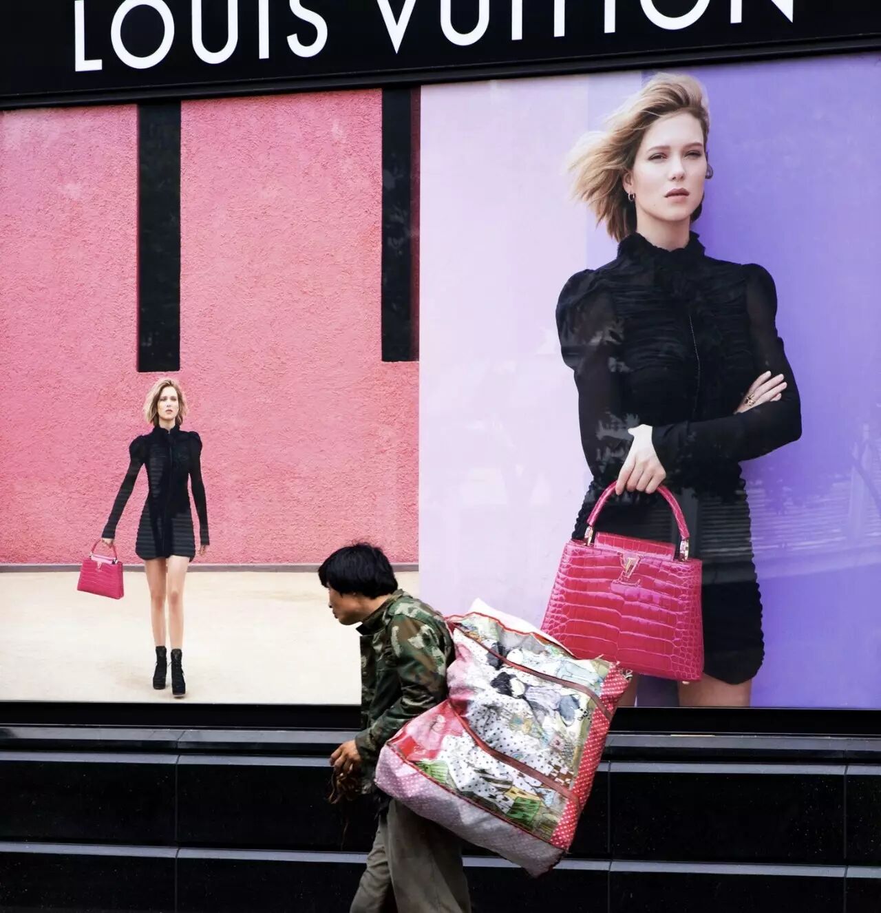 點評:大、中、小人物形成了對比,模特和前景人物所持有包包的檔次差異,形象地展示出兩種不同生活方式。如取景時相機能往左移些,同時延遲半秒左右釋放快門,畫面構圖效果將更趨理想。