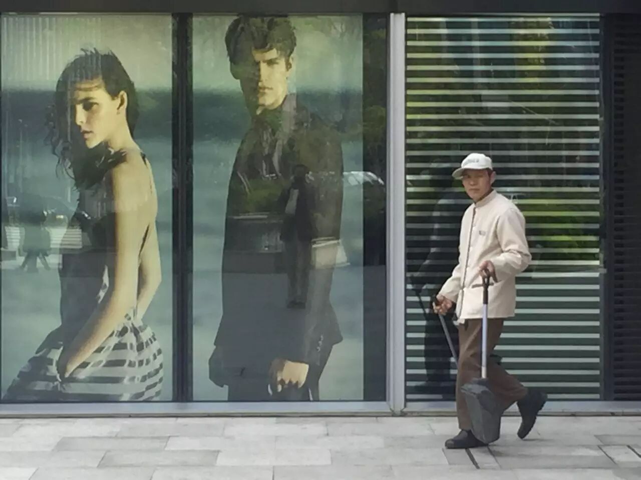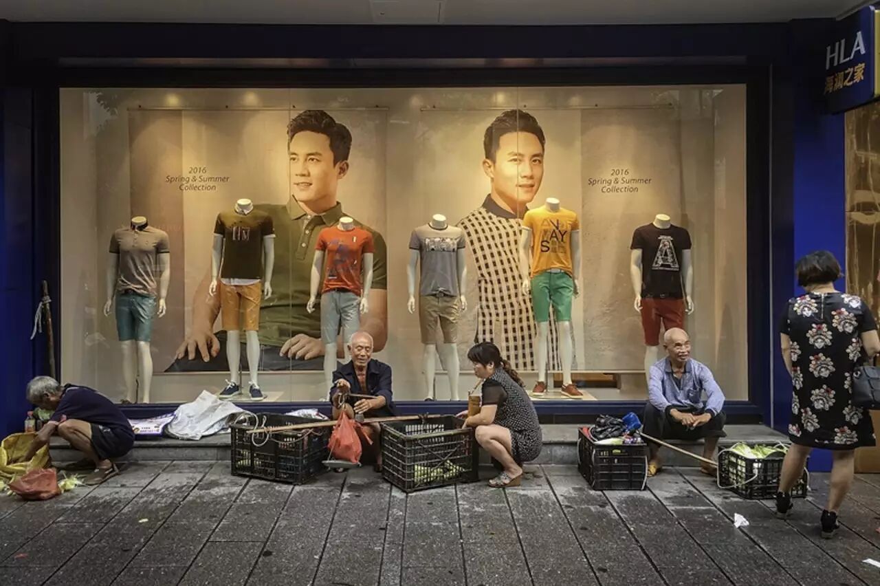 點評:將廣告牌中的帥哥靚妹,與生活中的覓活的“扁擔大叔”集納到一個畫面中。非常巧合的是,畫中人與實際人物的大小比例很接近,給人一種錯亂迷離,以假亂真般的印象。