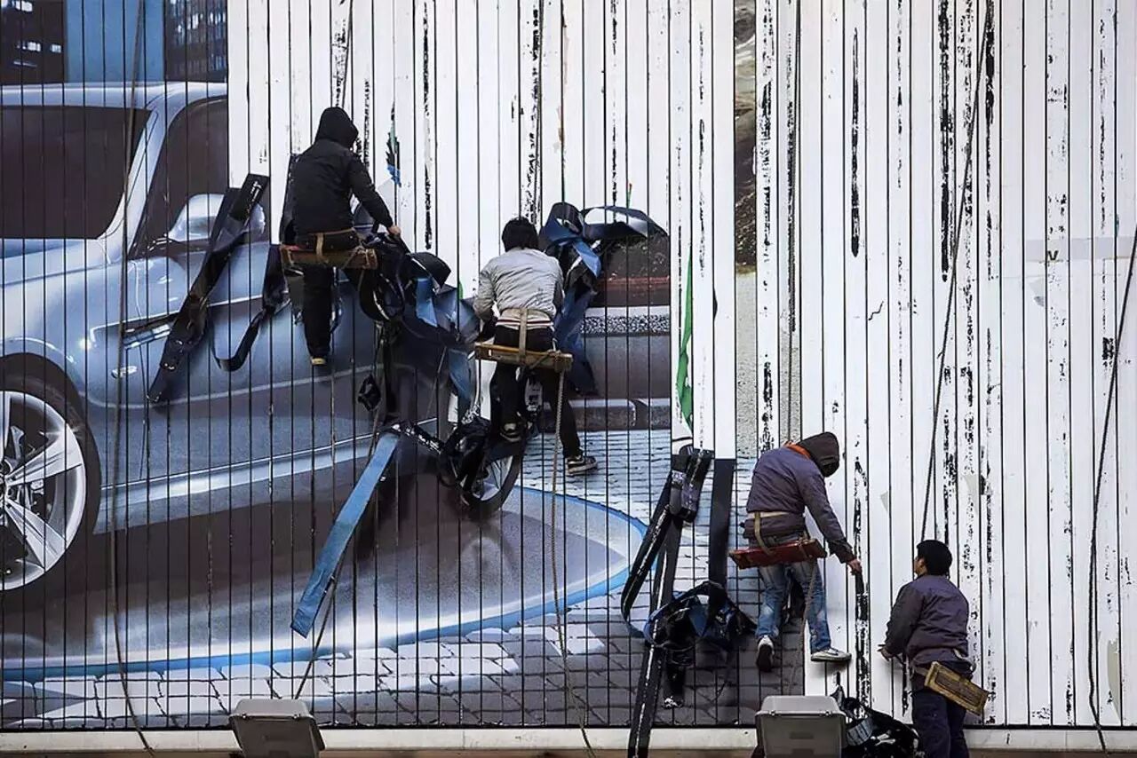 點評:廣告牌的除舊布新,是廣告發布運作的重要環節,各大城市幾乎每天都在演繹相關動作。拍攝單純的去除廣告顯然沒多大意義,而兩組“蜘蛛人”的加入,則使畫面展示出歌頌勞動者的積極主題。