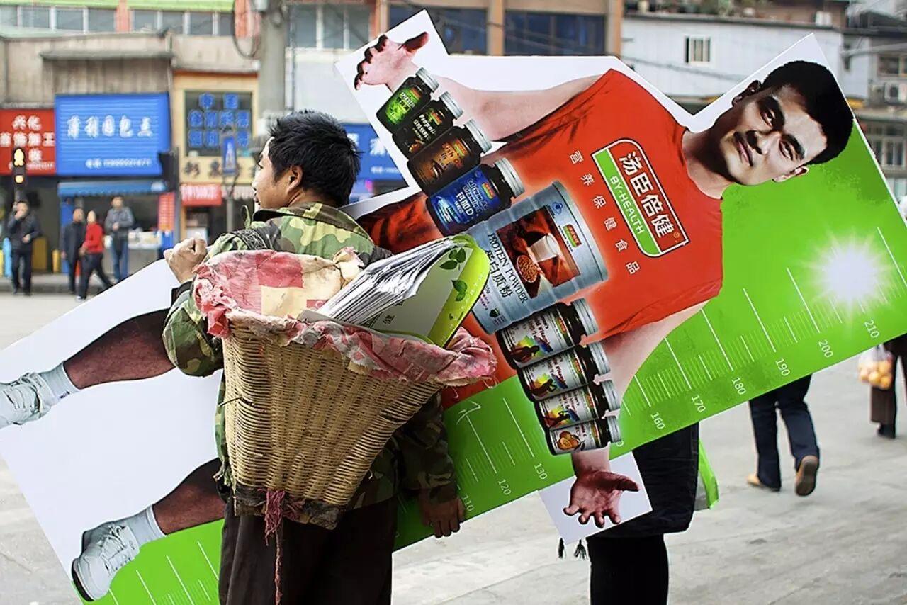 點評:托舉“姚明”的普通群眾與明星形象的獨特組合,呈現出三種對比效果:灰暗的迷彩服與鮮艷的紅運動服形成了色彩對比,人物形態的正與斜,構成了重心穩與不穩的對比,而略顯破爛的背簍與廣告保健品也形成了對比。多重對比所呈現的甜酸苦辣反差,令畫面充滿了喜劇色彩。