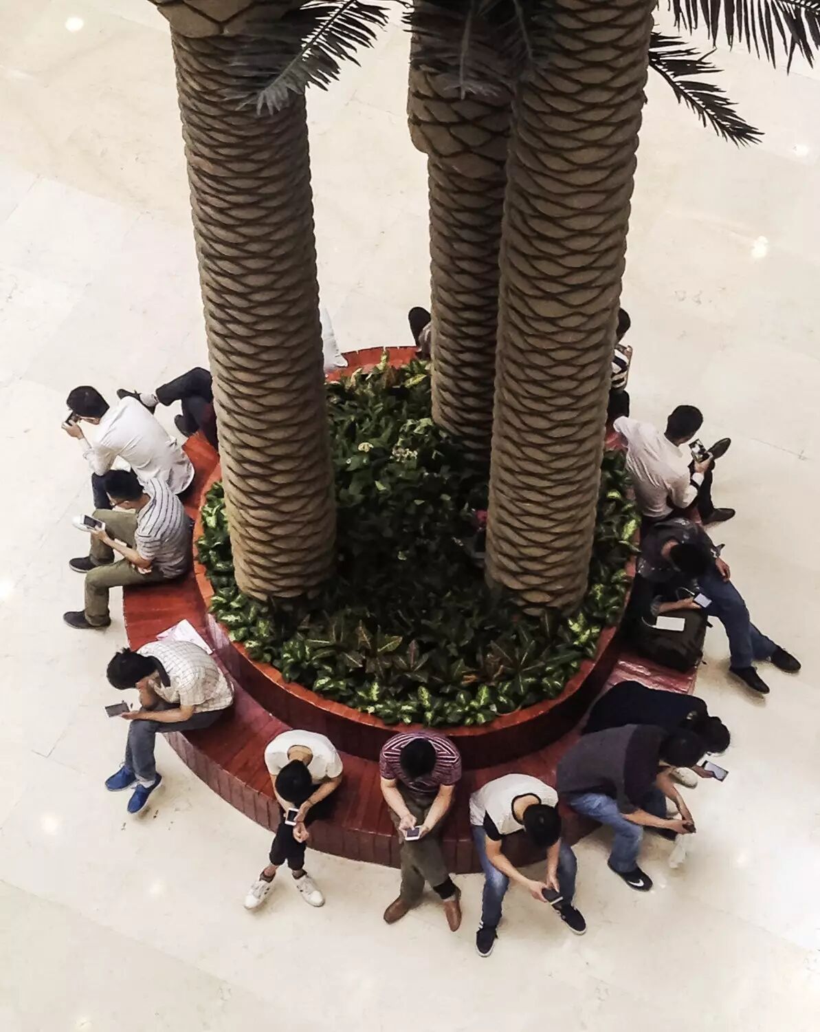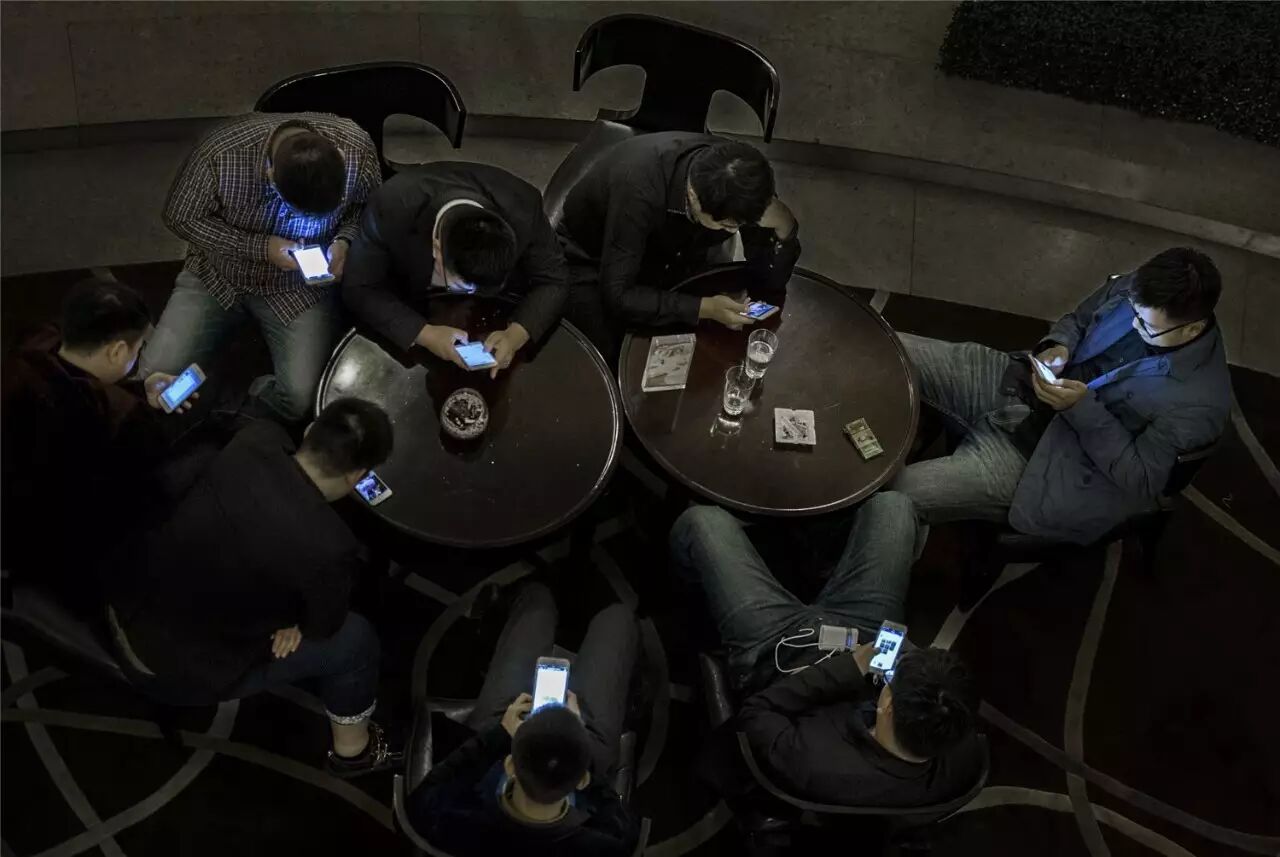 點評:這是一個非常能體現攝影者思考的瞬間。通過拍攝角度的變化和低頭族的各種動作,有趣地揭示了現實生活中同處一個空間的交流尷尬。當人們沉浸在手機交往和閱讀空間的時候,似乎已經不太在意面對面的交流了。手機屏所發出的藍光預示著同一空間的交流冷漠,灰灰的調子讓人際間面對面的交往失去了應有的色彩。